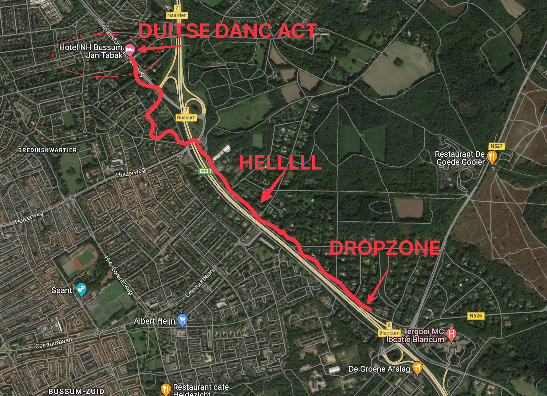 Deze straat ging uiteindelijk als brug over de snelweg heen, om een woonwijk in te gaan. Maar de weg die over de snelweg ging, was tegelijkertijd een op- en afrit. Daar hoorde je dus niet te lopen. Al had ik het serieus overwogen om de gok te wagen.